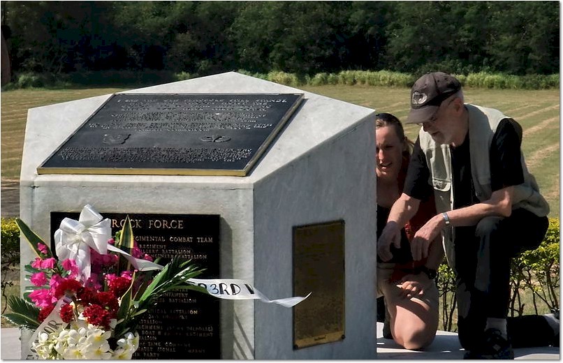 Father and daughter viewing plaques on the memorial. The plaques list the names of all the 503d KIA's on Corregidor.