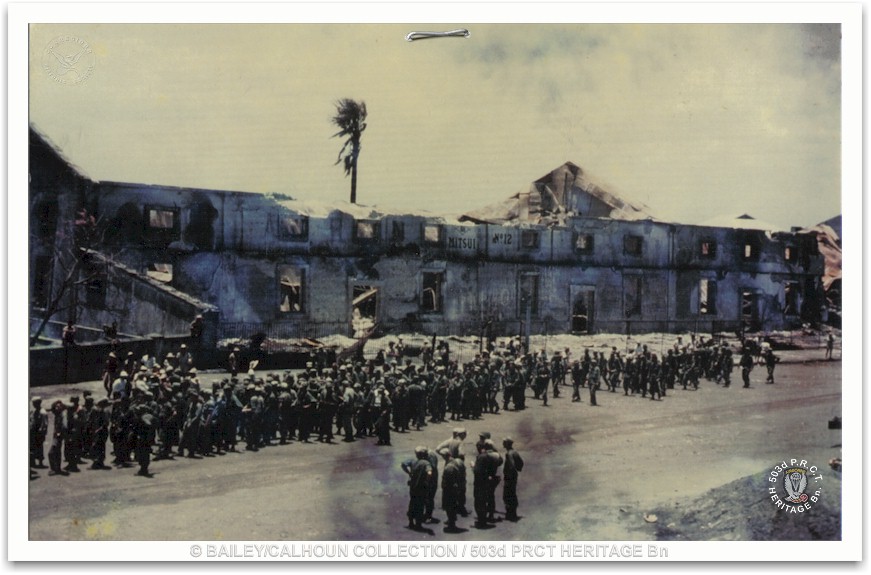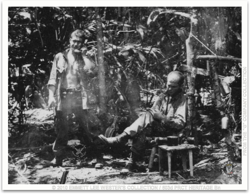 Late that same afternoon we see a flight of four Marine Corsairs coming in, as beautiful as their name suggests.  The first plane makes a pass at the Jap positions, and as he pulls up the Jap ack ack hits him and he goes down behind enemy lines.  The second plane makes his run and he too is hit.  Fortunately, after dropping his bombs, he turns towards our lines and bails out, hitting the ground about halfway between us and the Jap positions. Everyone opens up with everything we have to cover him, and he makes a run towards our line.  No football game or Olympic race was ever so exciting, and he falls into the closest foxhole he can find. No 503d guest was more welcome, nor arrived with a more exciting introduction, nor had a more dangerous night.