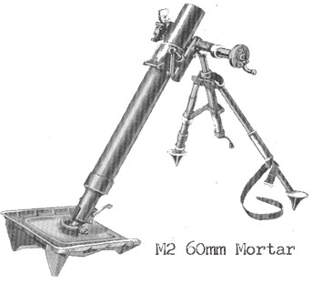 The Japanese infantryman had their Type 89 Leg Mortar, which fired a 50mm projectile. This muzzle-fed, trigger fired rifled weapon was widely used by the Japanese. It could be used by an individual soldier, although it was allocated to a three-man section. Light enough to be placed in a carrying case which was then strapped to a soldier's leg, an unfortunate translation of the title saw it called the "Knee Mortar" and the name stuck. The Type 89 had benefits in jungle areas that theM3 60mm Mortar did not. As well as ease of carriage, it could be aimed on a shallow trajectory (less than 45 degrees, if propped against a strong backstop to protect the operator), and fired with decent accuracy directly towards the target. Range was achieved by an adjusting nut that moved a rod up and down the rifled barrel. It was fired by pulling on a leather handle attached to the trigger. |