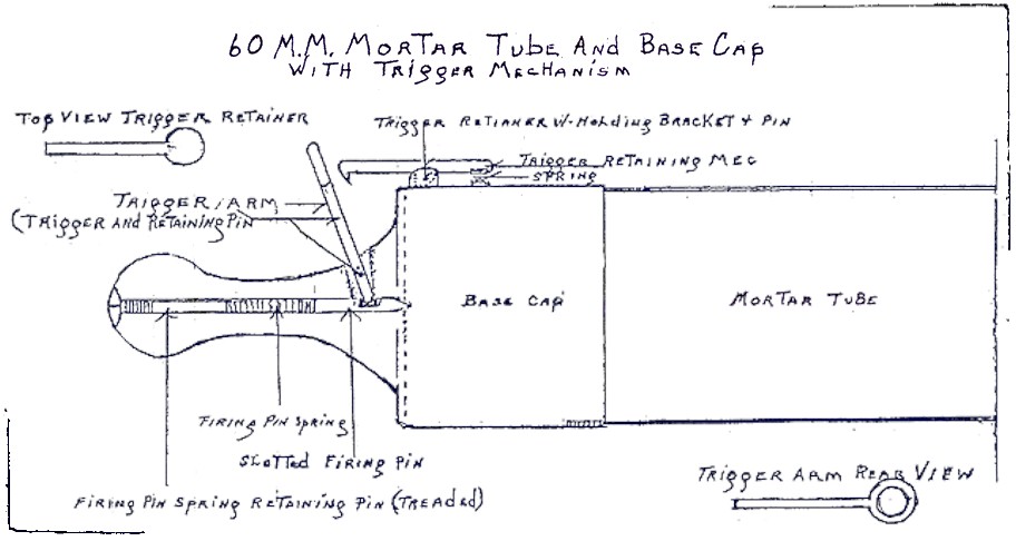 Essentially, Petzelt modified the base plate with a swing arm leg that could be easily emplaced to steady the mortar and control recoil when engaging targets horizontally. The mortar could not be "drop fired" in the conventional manner, so he designed a trigger activated firing pin mechanism. The barrel would be supported in the hands and aimed directly at target without the necessity of a sight. It was crude, simple and deadly.